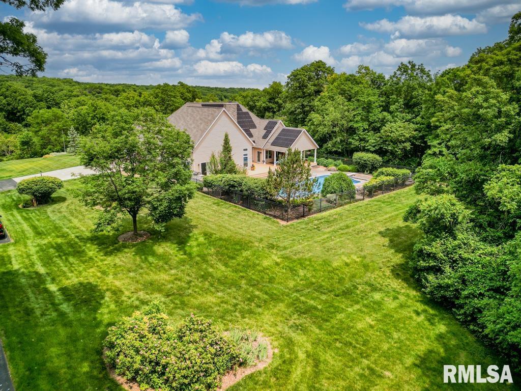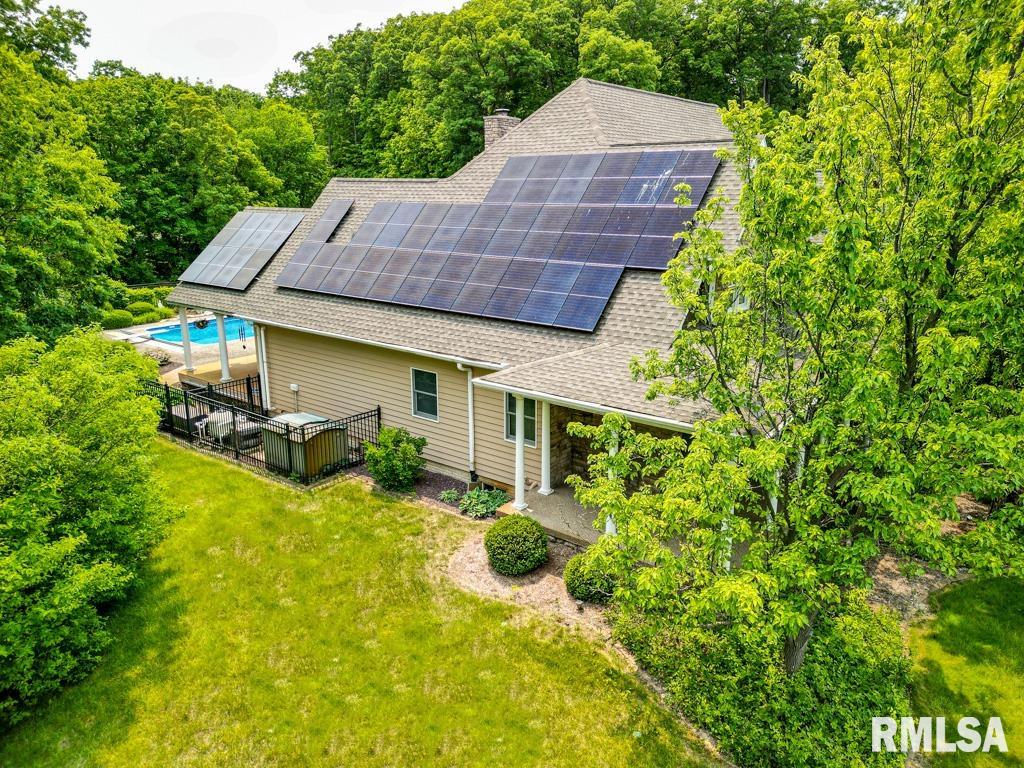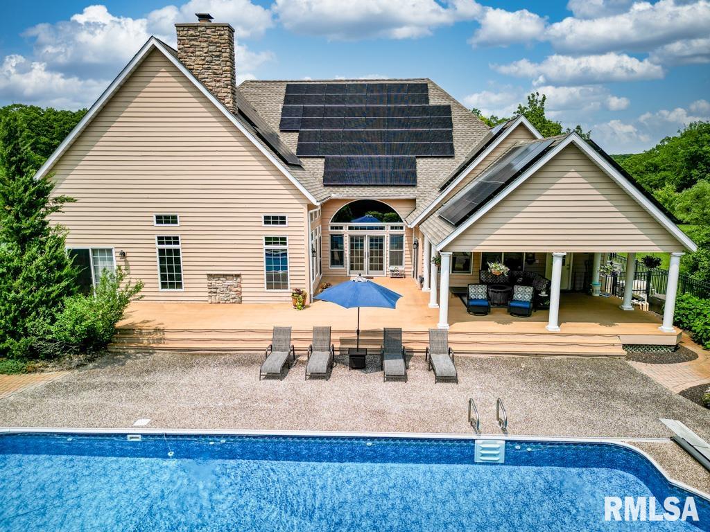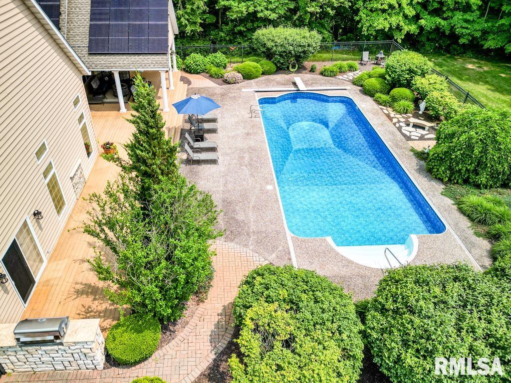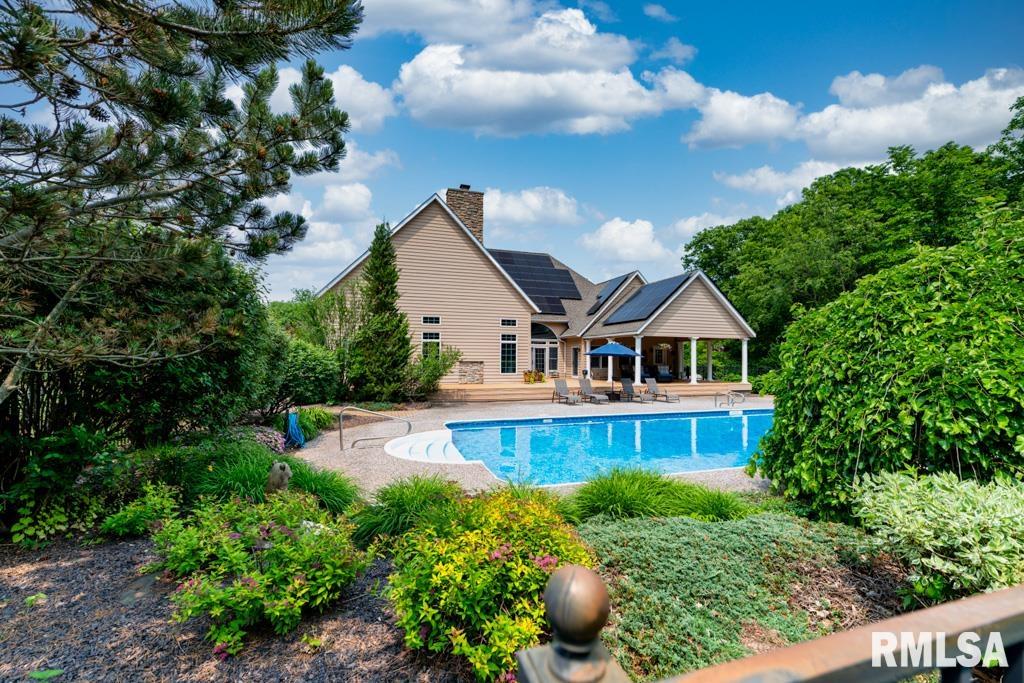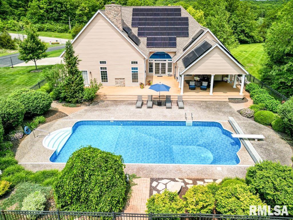 Exceptional private retreat in Dunlap School District! Nestled on over 5 acres, this 5 BR, 5.5 bath home offers a rare blend of luxury & privacy. Long-term savings with fully paid-off, top-of-the-line solar panels, providing impressive energy efficiency. Enjoy the resort-style in-ground pool, expansive composite deck, covered seating, built-in grill, & a convenient poolside full bath—perfect for relaxing all summer long. Inside, you’ll find vaulted ceilings, plantation shutters, and abundant natural light. The gourmet kitchen boasts a large island, high-end appliances, ceramic tile floors, and walk-in pantry. The inviting family room showcases a floor-to-ceiling stone fireplace, cathedral ceilings, custom woodwork, and wet bar, while a second great room with fireplace offers stunning backyard views through French doors and oversized windows. The main-floor primary is a true retreat with private outdoor access. A 2nd main-level suite offers flexibility and the upstairs features private in-law quarters. The overall layout—with additional bedrooms and private living spaces on the upper and lower levels—is ideal for those seeking separation and privacy, including households with older children, guests, or multi-generational living needs. Finished basement has two BR’s, theater area, full bath, full kitchen, and workout area. A rare opportunity in Dunlap!