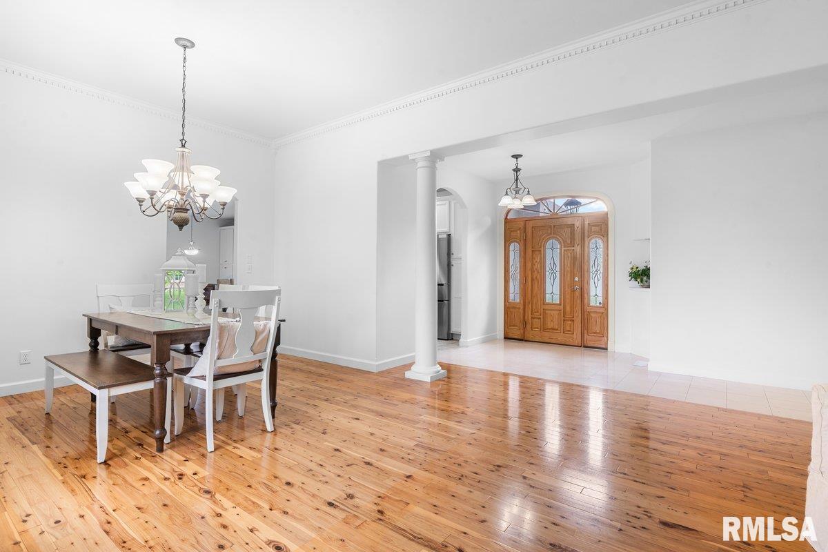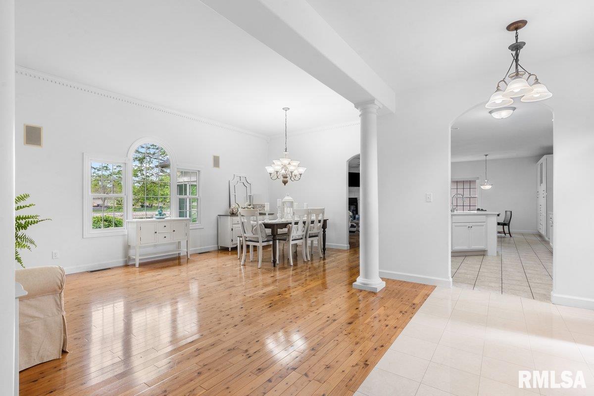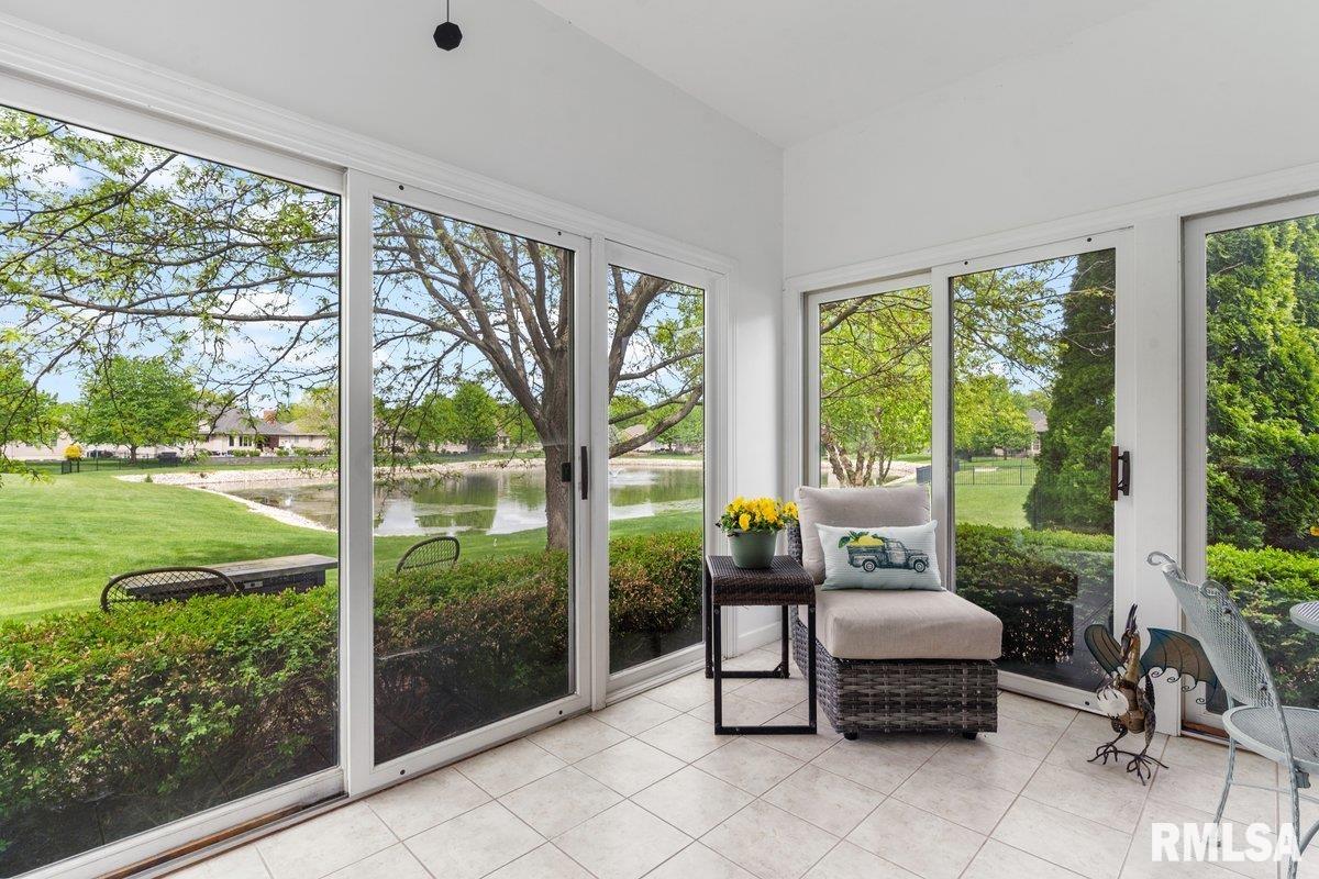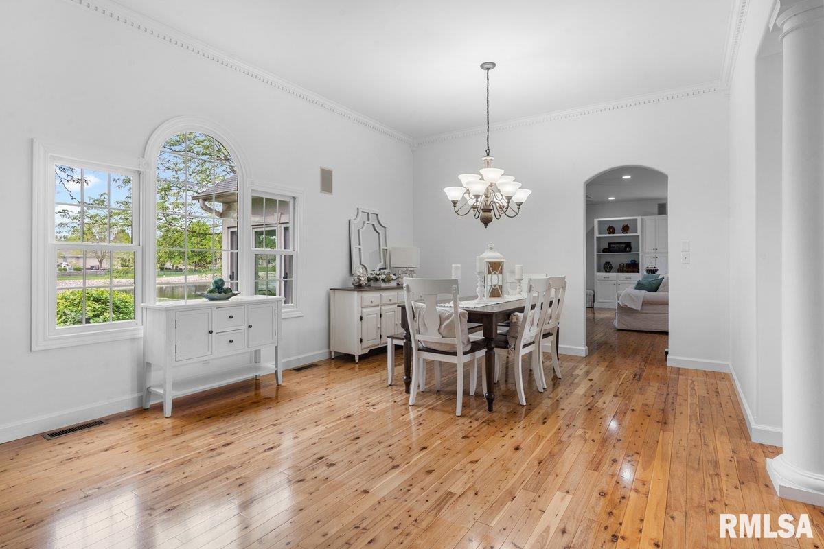 Exquisite home built in 2022, offering 2,629 square feet on the main level and a full unfinished basement just waiting for someone to finish. There are 2 egress windows and plumbing for a full bathroom in the basement. Step inside to a grand foyer with 2 architectural columns upon entry, and gorgeous hardwood flooring throughout most of the home. The hardwood floors complimented with ceiling variations and crown molding add a special charm. The spacious kitchen is a true centerpiece, showcasing crisp white cabinetry, newer quartz countertops and a stylish white backsplash, accented with stainless Bosch appliances that add a touch of class. Enjoy an extra large primary suite and bath with a jetted tub and walk in shower. The laundry room is phenomenal with major storage and a wash tub. Relax in your 3 season room that boast of panaramic views of the lake/pond from the back of this elegant home. Open space and water. Very peaceful. This home seamlessly blends modern luxury with timeless design, offering both beauty and functioinality in every detail.